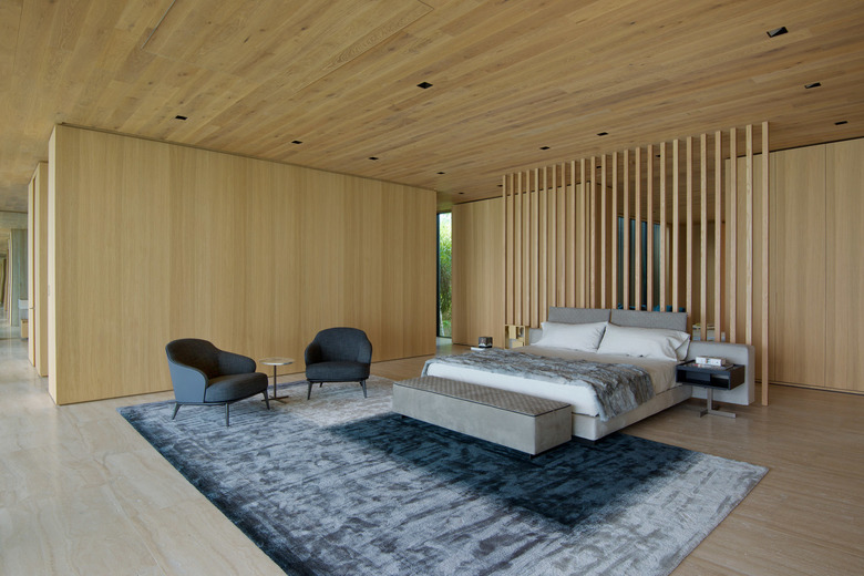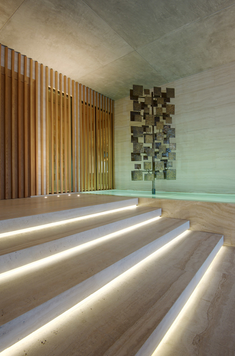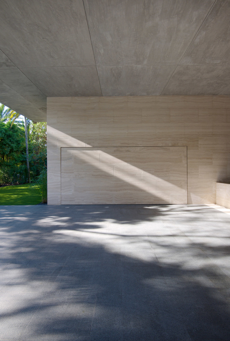 The home is designed within volumes that shift to create a sequence of courts. Base volumes clad in stone shift beneath the upper concrete volumes. These are detailed to preserve the purity of the elemental forms through restrained materiality of concrete, travertine, and custom finished wood.