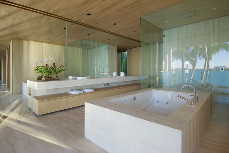 The landscaped roof deck areas and wood-clad jacuzzi offer a view of the bay and neighboring islands.