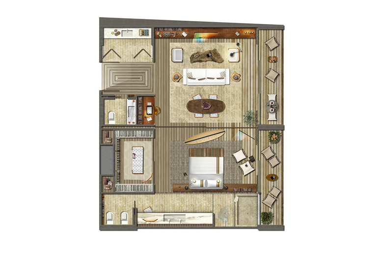 The interiors, designed by Arthur Casas, are inspired by the work of artist and landscaper Roberto Burle Marx – designer of the Copacabana beach promenade. The work of Brazilian masters, such as Sergio Rodrigues, as well as contemporary designers like Paola Lenti, are integrated throughout.