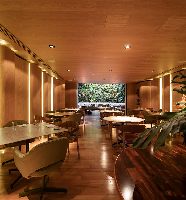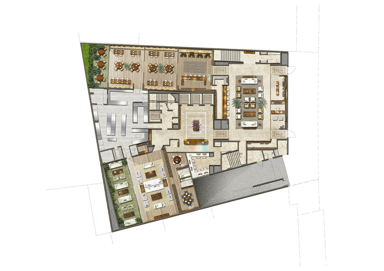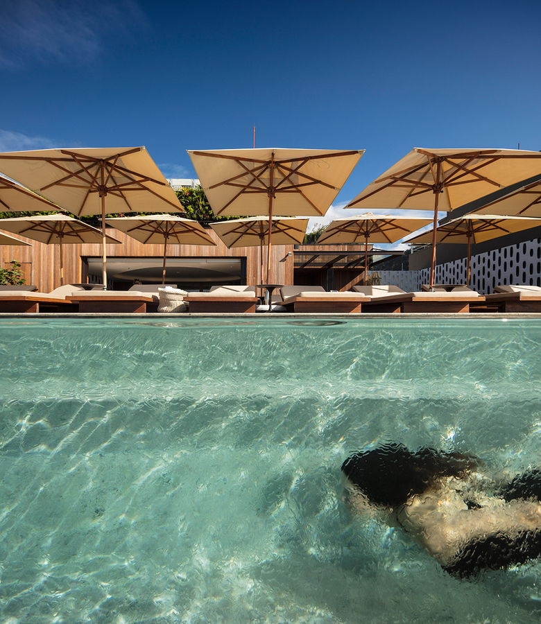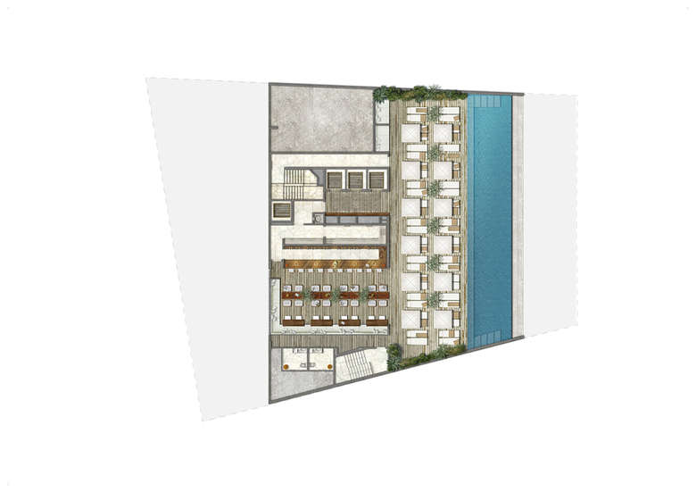 Guests circulate and inhabit the hotel in total privacy, away from the general public. The ground floor includes a bar adjacent to the entrance before visitors are directed in one of two ways. The first route leads to the restaurant and business center. The other leads to the hotel’s reception with a private area for guests. The building holds 90 units across 12 floors, with on-site amenities including a gym, a spa, and a sauna. Both the restaurant and a private library open up to separate courtyards filled with tropical vegetation.