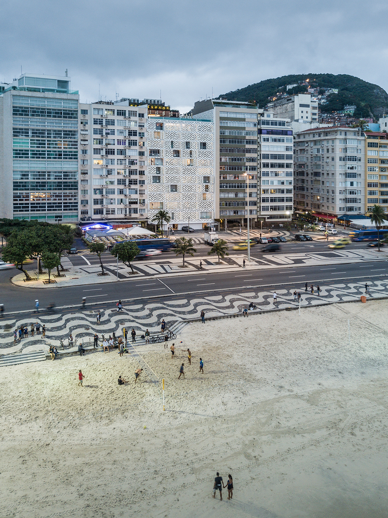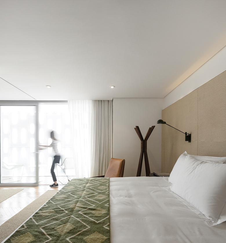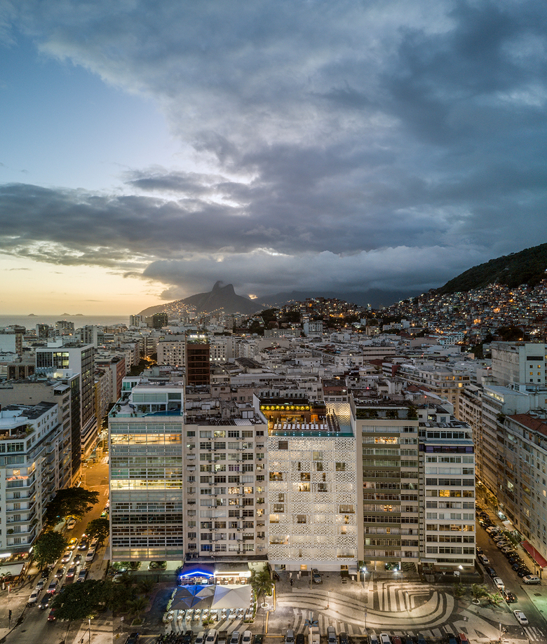 Inspired by Rio’s landscape, a distinctive façade fronts the hotel and differentiates it from the neighbouring concrete buildings. The weatherproof panels can be completely opened from bedroom balconies, resulting in an elevation that constantly changes in response to the requirements of each guest. When open, the panels allow natural light to flood the interiors. While closed, the panels ensure privacy without compromising light, ventilation, or views.