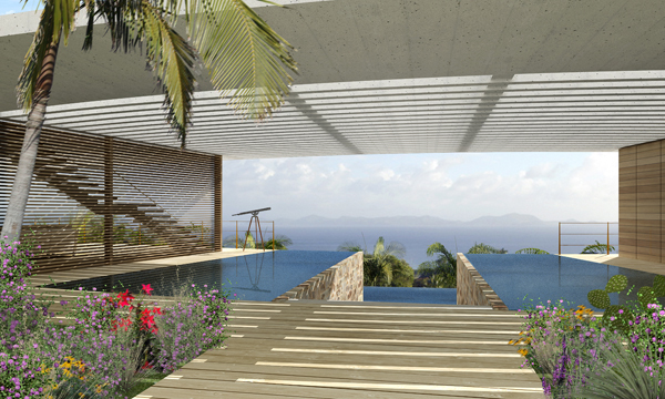 The island of Mustique is a rough beauty-- a rocky outcrop emerging from the cerulean waters of both the Caribbean and the Atlantic. Ultra opulent villas scatter across beach, forest, hill and cliff evoking otherworldly styles. Towards the center of this rustic playground for the rich and famous is a gently sloping site, triangulated in shape, and expertly vegetated with exotic flora. The most dramatic views of the Ocean and surrounding islands are obtained from the utmost top of the property along the shared access road. Zoning regulations and view maximization establish an incredibly long, linear building envelop.