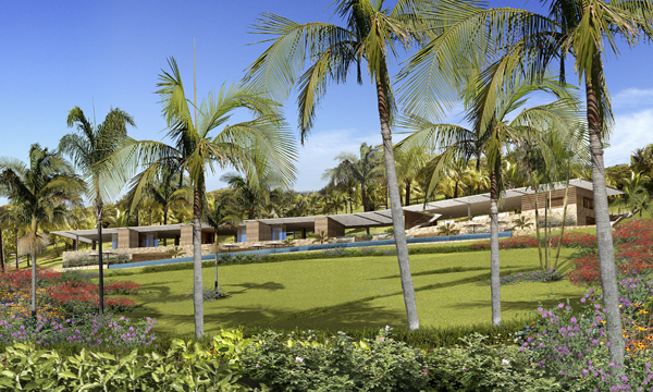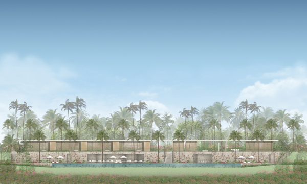 As you turn off one of the main island roadways you confront a compressed experience traveling between stone retaining walls overflowing with vegetation. A small carve-out and a transformation of ground surface material from concrete pavers to cut stone signifies a sense of entry and location for mule parking is obvious. Framed by large, flowering canopy trees, a stone portal of distinctive proportion surrounds a wooden door rich and simple in texture. On crossing through the threshold one encounters a spectacular vista framed by an intimate courtyard with a central water feature that feeds a small channel surrounded by carved benches primitive in nature. Shoes off, one enters the home on access with a majestic tree surrounded by floating stairs both ascending and descending. To the left are public living spaces, while to the right are the private living quarters. Materials in the house are comfortable, distinctive, and sincere. Smooth finished concrete floors, off white in color, flow through the open spaces juxtaposed against weather worn teak shutters, and decks. The living area is expressed as an open pavilion between landscape and view.  Furniture is low, sleek and incredibly comfortable-made of incredibly rich material; yet simple in form. Decorative screens divide individual moments in the room providing opportunities for private dinning. A utilitarian kitchen and service area set forth a sense of enclosure.