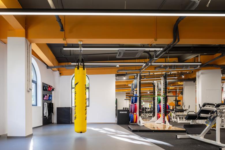 The second-floor fitness area extends the climbing vocabulary: dumbbells adopt the earthy-orange climbing palette, while the backdrop flattens the wall into a graphic diagram—like a 2D topo of routesetting. The raw cement finish grounds the space with the gravitas of real rock.