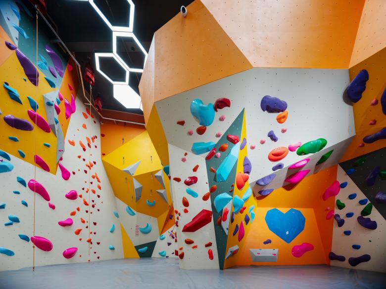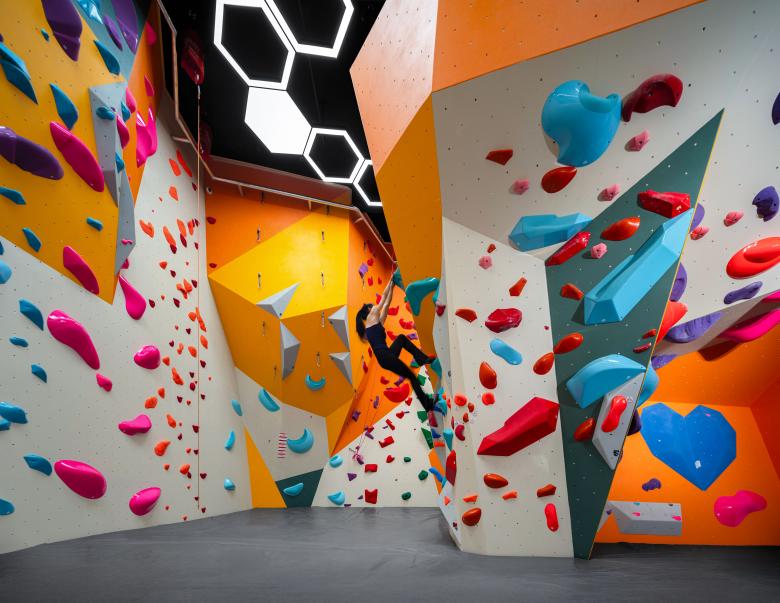 The bouldering walls combine volumes and holds in earthy tones, natural wood, and vibrant orange—natural yet energetic. Custom grips shaped like hearts, numbers, and letters add playful surprises. Overhead, polygonal lighting hovers like invisible routes traced by setters, turning every move into a performance of light and body.