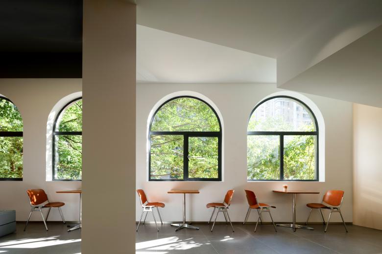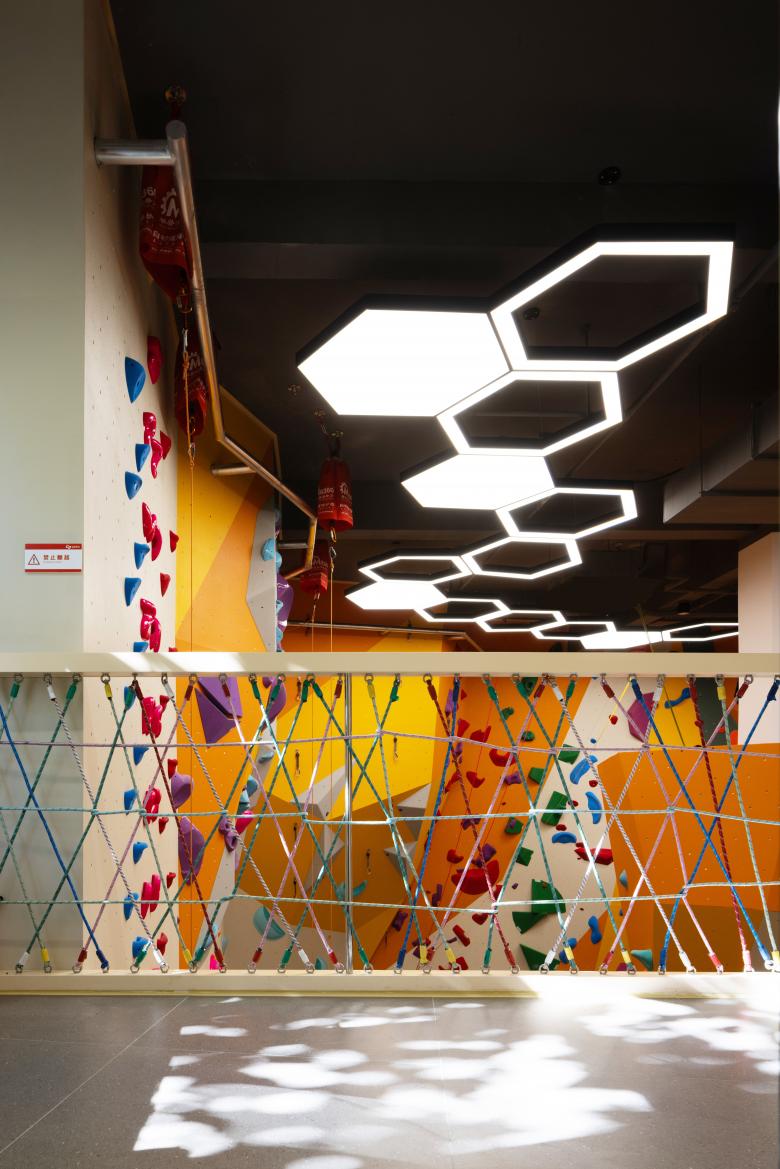 The open coffee space allows seated guests to interact with the climbing area during breaks, fostering communication among activities within the venue. The section near the exterior wall utilizes natural light, enhancing environmental comfort. This space serves as an energy refill after workouts and a hub for climbers to exchange climbing techniques.The fences are woven from climbing ropes, embedding athleticism into the boundaries themselves. Here, neighbors bond through belay, turning climbing into