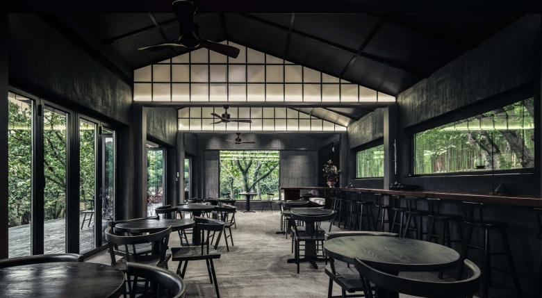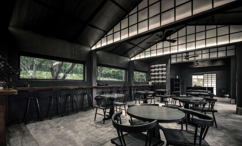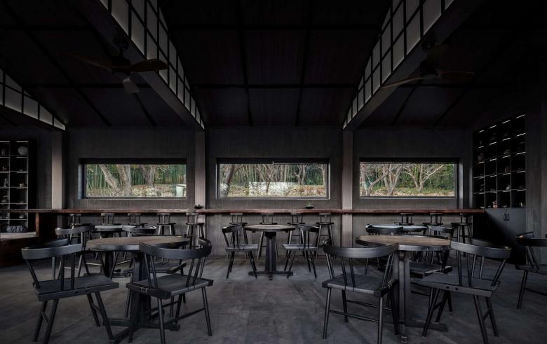 Continuing along the bluestone walkway, visitors reach the Lilin Coffee Rest & Experience Area, where the original sloped roof and architectural form are preserved, with only the exterior wall color and door-window system partially optimized to align with the project’s Zen, natural aesthetic; clad in black wood veneer and framed by large full-height glass windows, the building creates an unobstructed visual corridor, allowing mountain forest views to permeate the interior, blending indoor and outdoor spaces to evoke the tranquil atmosphere of “the house nestled in the forest, the forest embracing the house”.