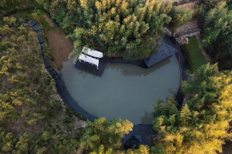Crossing the bamboo forest east of the Rest & Experience Area, visitors reach the stream and heart-shaped mountain pond on the eastern site. Mountain spring water is channeled to form a meandering stream that follows the natural terrain, flowing into the pond with gentle gurgling sounds to create a rustic Zen atmosphere of forest-water symbiosis, while wooden walkways and platforms invite visitors to immerse themselves in the tranquil, nature-infused setting.