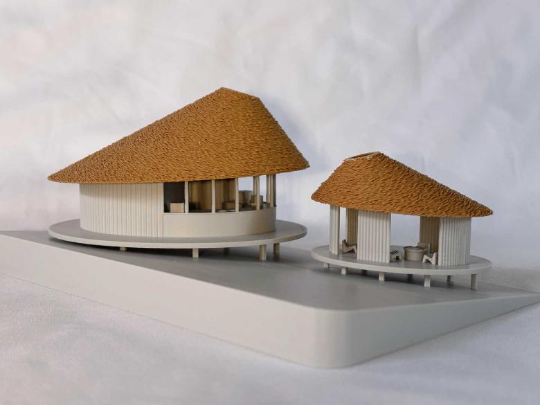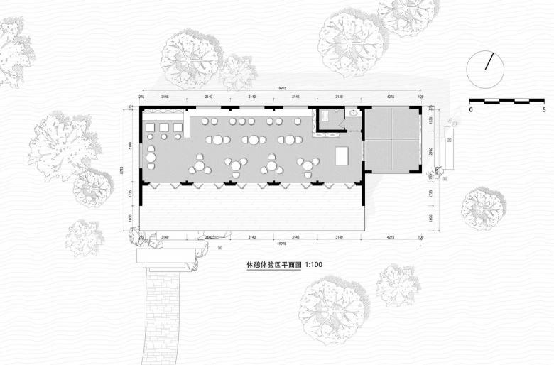 The Woodland Tea House lies opposite the serving area, hidden in the chestnut grove. Designed with the core idea of "blending into nature", it uses an elevated lightweight steel structure to maximize preservation of native vegetation and terrain. From a hillside view, the tea house blends into the wooded slope, blurring the line between man-made structures and nature.