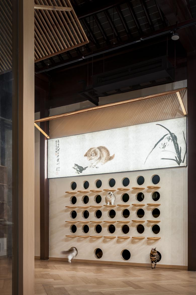 The designer has created dedicated rest areas for the cats, featuring walls adorned with neatly arranged circular openings that hold feeding bowls at varying heights. This thoughtful design not only accommodates the natural behaviors of felines but also enhances interactive experiences between visitors and the cats, consistently delighting guests with unexpected moments of joy.