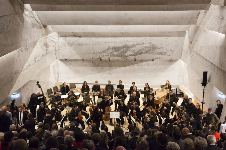 Der monolithische, gekippte Baukörper öffnet sich für die Konzertbesucher auf dem neuen Dorfplatz und führt von dort diese über eine Treppe hinab in das unter der Erdoberfläche liegende Foyer. Dieses erschließt nicht nur die Funktionsräume wie die Garderobe, die Sanitärräume sowie den Barbereich, sondern führt auch spannungsreich um den Zuschauerraum herum ins Innere des Konzertsaales. Dieser entfaltet seine Akustik innerhalb des leicht wirkenden Betonkörpers, dessen präzise Lichtschlitze den Raum beleuchten. Der Baukörper des Konzertsaales ist in Ortbeton gefertigt, dessen diffizile Form nur mittels einer äußert aufwändig konstruierten Schalung realisiert werden konnte. Die dominanten gekippten Oberflächen des Konzertsaales sind allein akustischen Vorgaben geschuldet und beinhalten hinter ihren Schlitzen neben LED-Leuchten auch Bassabsorber, die eine optimale Akustik bieten. Der Beton im Inneren des Konzertsaals ist unbehandelt. Seine lebendigen Oberflächen dienen dazu, die mittelhohen Töne zu absorbieren. Die Schräge des Baukörpers - bedingt durch die Steigung des Hanges - trägt die Zuschauertribüne, deren transparent wirkenden Stühle über Lichtschlitzen zu schweben scheinen. Die Stühle sind auf Eisenschwertern aus Stahl, auch unter den Stufengängen sind Absorber eingebaut. Die Bühne des nicht als Multifunktionsraum, sondern allein als Konzertsaal konzipierten Gebäudes ist mit moderner LED Bühnentechnologie ausgestattet.