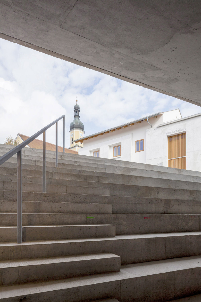 Das Konzerthaus ist das Herzstück der städtebaulichen Maßnahme, mit der der Ortskern von Blaibach revitalisiert wird. Es befindet sich neben dem neuen Bürgerhaus und komplettiert mit der Anlage eines neuen Dorfplatzes das mit Mitteln der Städtebauförderung realisierte Bauvorhaben. Das Konzerthaus ist ein Solitär aus Beton, der sich mit seiner Neigung über die Hangkante im Ortszentrum an der Topografie orientiert und mit seiner Granitfassade an die Steinhauertradition Blaibachs anknüpft.
