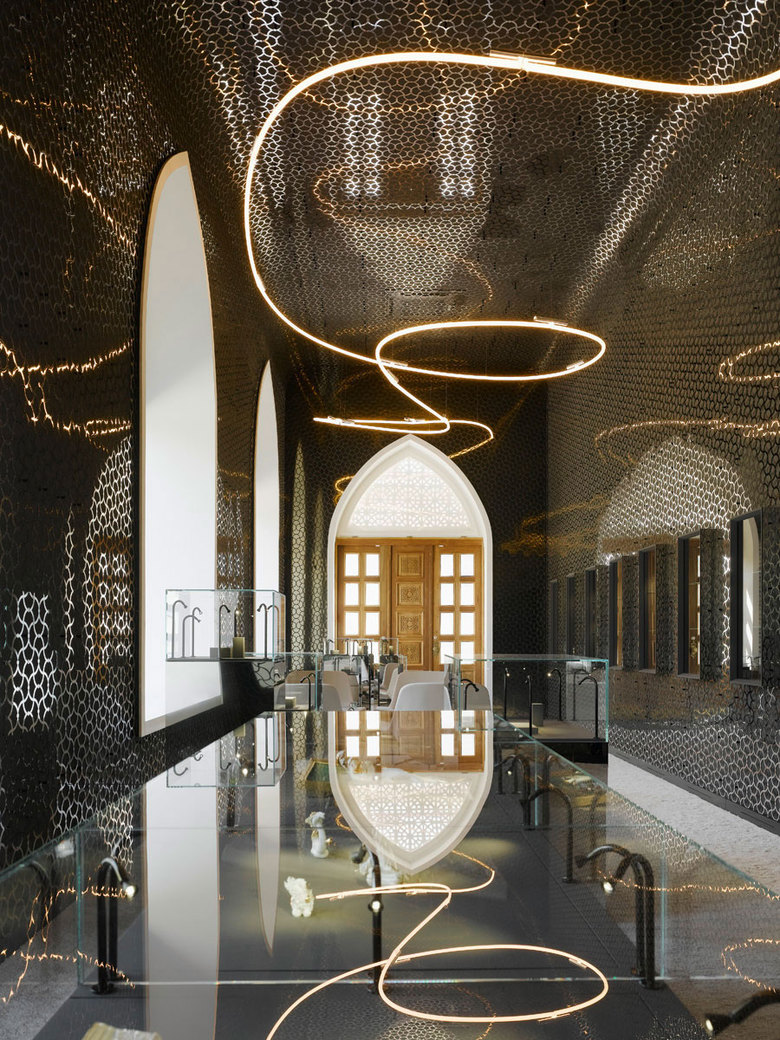 Die raumbildende Verkleidung der Galerie aus einem gelaserten, hochglanzpolierten Edelstahlornament sollte nicht durch eingebaute Leuchten gestört werden. Eine frei skizzierte, geschwungene Neonlinie schwebt daher als einziges Lichtelement im Raum.