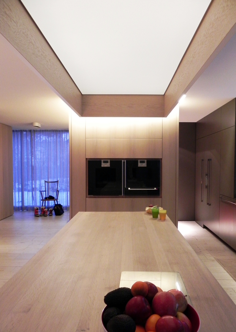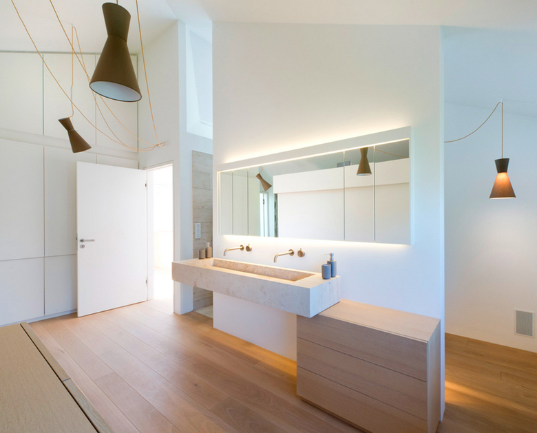 durch eine indirekte Wegebeleuchtung zum Hauseingang geführt; ein Teich wurde mit der Glasfaser-Sonderleuchte "Munich Reeds" in ein poetisches, schimmerndes Lichtobjekt verwandelt. Im Spa- und Wohnbereich sorgen blendungsbegrenzte Downlights für hohen visuellen Komfort, im indirekt beleuchteten Treppenhaus schwebt ein "Hausgeist" im Treppenauge: ein hochglanzpolierter Tropfen aus poliertem Aluminum, der von unten angestrahlt wird. Die Zimmer und Bäder der Familie werden durch ein speziell für das Projekt gestaltete "Leuchtenfamilie" erhellt: spielerisch in verschieden Höhen und Winkeln abgependelt, sorgen Leuchten mit farbigen Stoffschirmen und Stoffkabeln für direktes und allgemeines Licht. Sie sind flexibel an einem Hakenraster fixiert und begleiten das Wachstum (der Kinder) ebenso wie weitere Veränderungen innerhalb der Räume.