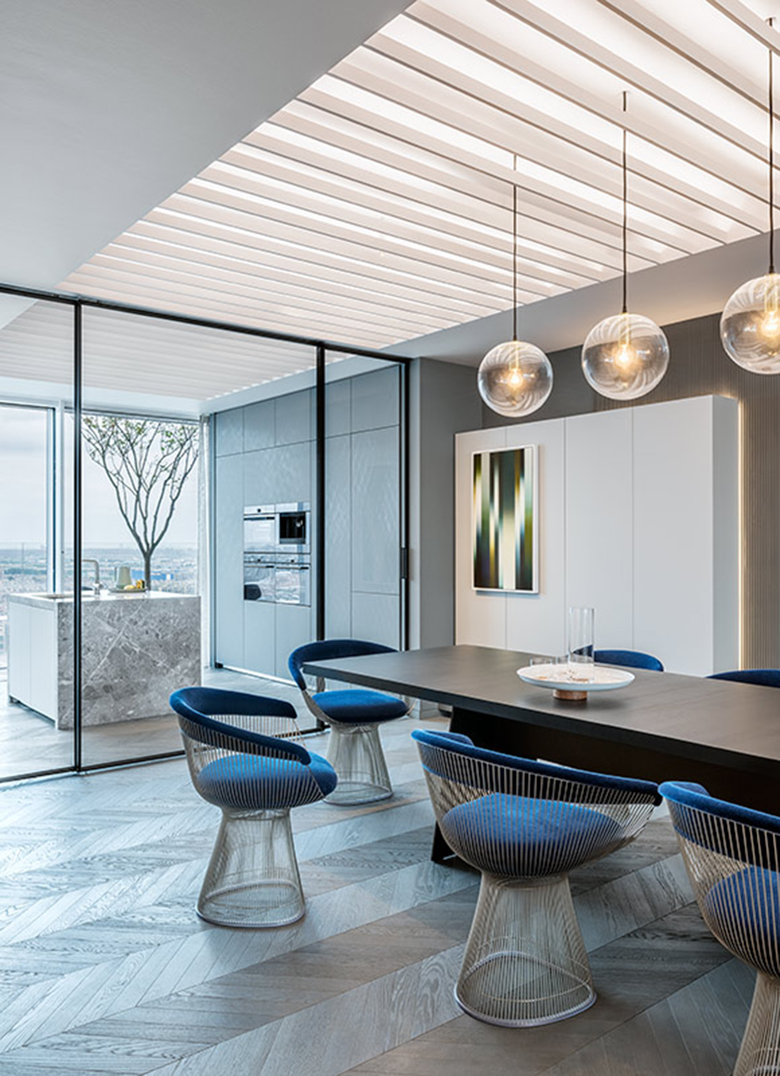 Bedingt durch die Lage der Wohnung im Zentrum des Turms und die damit verbundenen, großen Raumtiefen schlugen die Lichtplaner vor, die Deckenfläche mit einem großflächigen Lichtfeld auszustatten, als Sinnbild für ein Oberlicht, einstellbar für die wechselnden Stimmungen am Tag und in der Nacht. In die schmalen Deckenlamellen sind lineare LED-Lichtprofile integriert, die sanft die darüber liegende Deckenfläche beleuchten. Das Indirektlicht taucht den gesamten Raum in eine sanfte Grundlichtstimmung, welche diesen optisch erhöht und durch den Einsatz von „TunableWhite“-Technik regelbar ist. Sowohl die Farbtemperatur als auch die Lichtintensität können den Gegebenheiten und individuellen Wünschen entsprechend verändert werden. Ergänzt wird diese großzügige Geste durch oberhalb der Lamellen-Ebene montierte, justierbare Strahler, welche Licht dort ergänzen wo es gebraucht wird, z.B. auf der Arbeitsfläche in der Küche, zur Beleuchtung von Kunstwerken, Objekten, Regalen.
