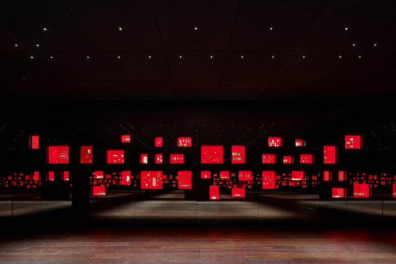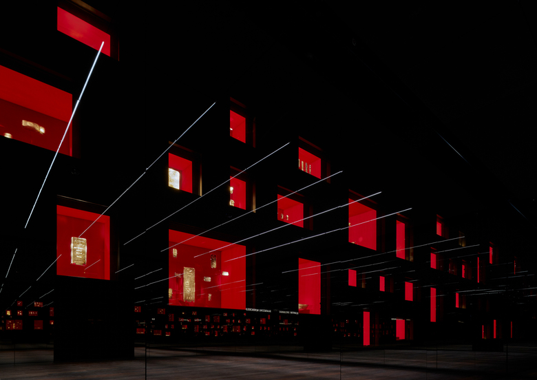 Ein raumhohes Sandwich aus 19 mm Panzerglas und Spion-Spiegelglas schützt die Vitrinen und stellte für die Lichtplaner eine große Herausforderung dar. Aufgrund der Dicke der Glasschicht und des hohen Absorptionsgrads mussten innerhalb der Vitrinen sehr hohe Leuchtdichten realisiert werden. In zahlreichen Versuchen und mit einem 1:1- Mock-up wurden mehrere Beleuchtungsprinzipien entwickelt und getestet. Die Lichtplaner zeigten auf, welche Materialien, Farben und Lichttypologien sich optimal für die Präsentation der Sammlung eigneten. Die Entscheidung fiel auf die folgenden Kombinationen aus Material und Licht:
