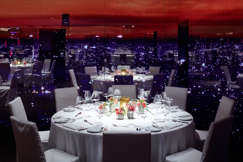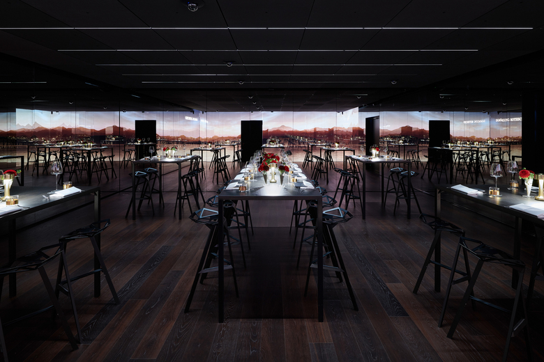 Als zweites System wurde, unter Zugrundelegung unterschiedlicher Bestuhlungsvarianten, ein Layout aus LED-Mini-Downlights entwickelt und zurückhaltend in die Deckenkassetten integriert. So können diverse Szenarien, z.B. Gruppierungen mit verschieden großen Tischen sowie eine Seminarbestuhlung, punktgenau beleuchtet werden.