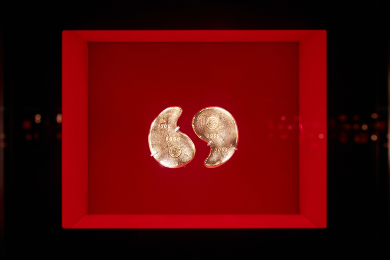 Das "Objektlicht" setzt das Gold in Szene. Ein vierseitig unsichtbar integriertes System aus Miniatur-Strahlern illuminiert die Exponate mit warmweißen Licht. Sie sind präzise justierbar, mit unterschiedlichen Optiken ausgestattet und werden durch ein faseroptisches System gespeist, das je Vitrine nur einen Projektor mit einer LED-Lichtquelle benötigt. In jeder Vitrine wurden zwischen 12 und 28 dieser Lichtköpfe mit zwei unterschiedlichen Ausstrahlungswinkeln ( 5° und 10°) verwendet, um die zum Teil hochkomplexen Arrangements liegender oder schwebender Exponate wirkungsvoll zu inszenieren. Die Integration und Detaillierung der faseroptischen Systeme bildete die Basis für die Planung der Vitrinen und wurde anhand von 1:1-Modellen getestet. Den Lichtplanern war es wichtig, dass weder sichtbare Lichtköpfe noch Blendpunkte den Einblick in die Vitrinen und die Betrachtung der Exponate stören.