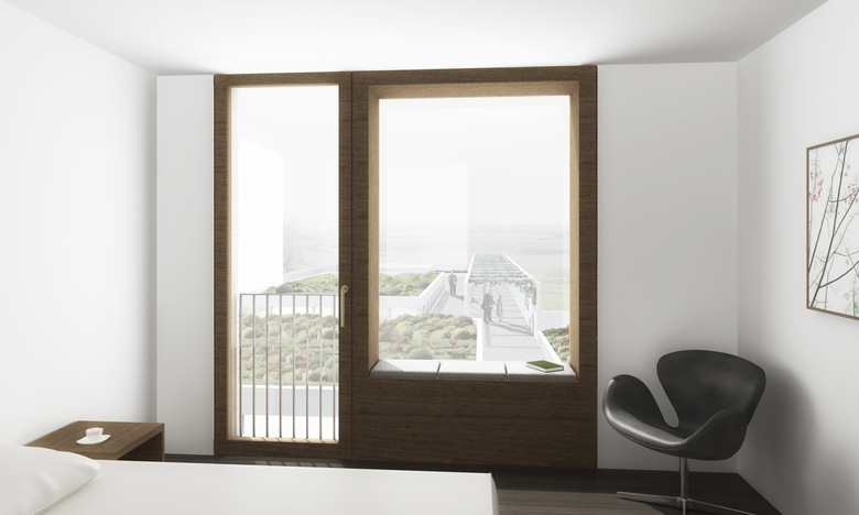 Das neue Wohnhaus fügt sich analog zu den bestehenden Alterswohnungen entlang der Hangkante in das Ensemble ein. Alle Wohnungen sind klar nach Süden orientiert und profitieren von einem atemberaubenden Ausblick auf die Berglandschaft und den See. Wohnzimmer, Loggia und jeweils ein Zimmer bilden eine räumliche Einheit, die durch die entstehenden Blick- und Raumbezüge einen erhöhten Wohnkomfort und Nutzungsflexibilität bietet. Gleichzeit erhalten die Wohnungen durch die zentrale Lage der Loggia zwischen Wohnbereich und Zimmer ihren speziellen Charakter.
