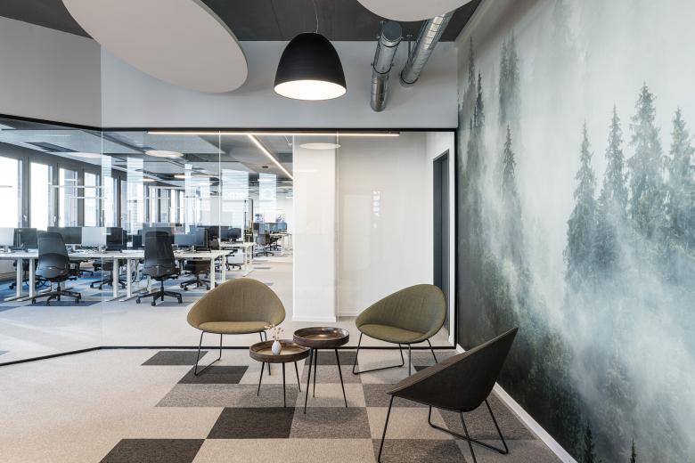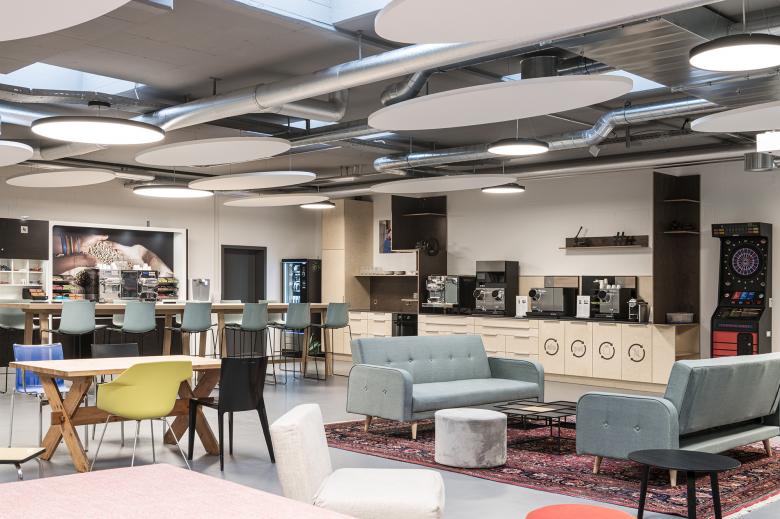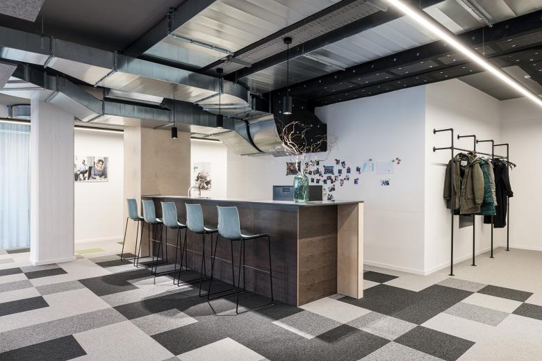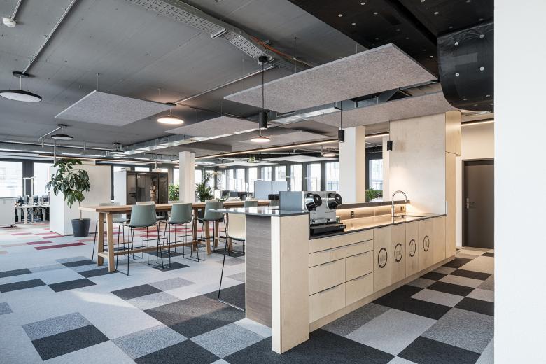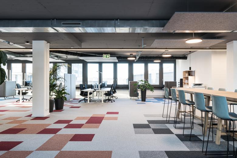 Ein frischer Anstrich, ein neues Beleuchtungskonzept sowie die Akustikdeckensegel und die spielerisch farbenfrohe Anwendung der Teppichquader, welche die jeweilige Raumzonen begrenzen, geben den Räumlichkeiten eine behagliche Atmosphäre und bieten den Mitarbeitenden einen angenehmen und modernen Arbeitsplatz.
