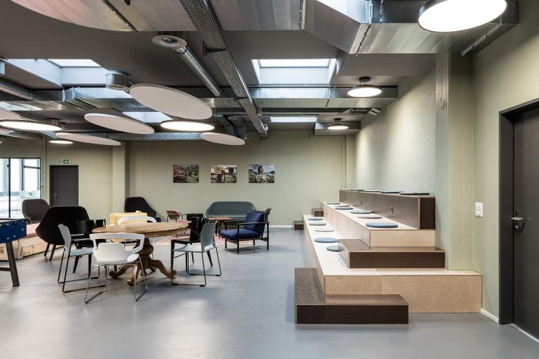 Zu den zeitgemäss gestalteten multifunktionalen Einbauten mit naturbelassenen Sperrholzoberflächen gehören der Empfang, die zwei Tee- und die Personalküche sowie die drei Druckerstationen und die Sitztreppe in der Eventhalle. Für die neue Klimazentrale auf dem Dach wird der Schacht des ausrangierten Lifts für geschossweise Erschliessung der Lüftung genutzt.