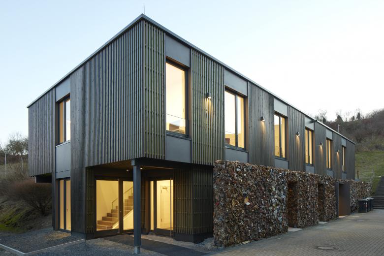 Energetisch durchoptimiert ist die Gebäudehülle, Holzständerwände mit Einblasdämmung, Nahwärmenetz, Flächenheizung und Sonnenschutz mit Lichtlenkungsfunktion.