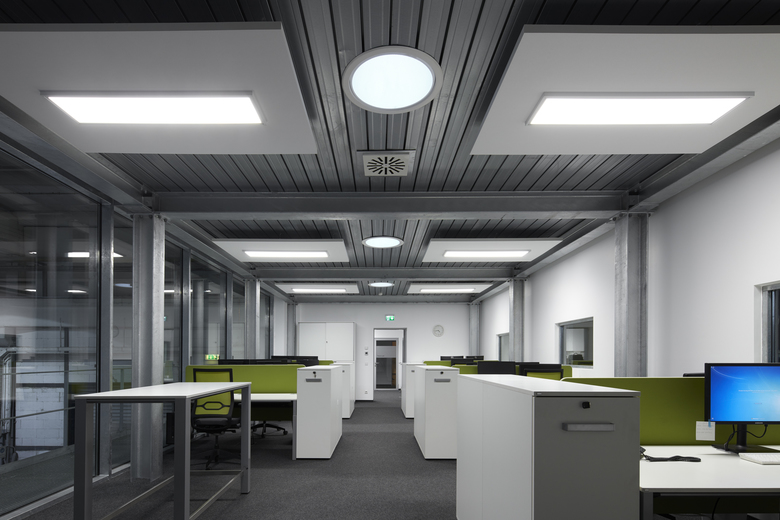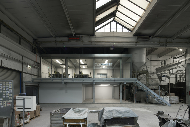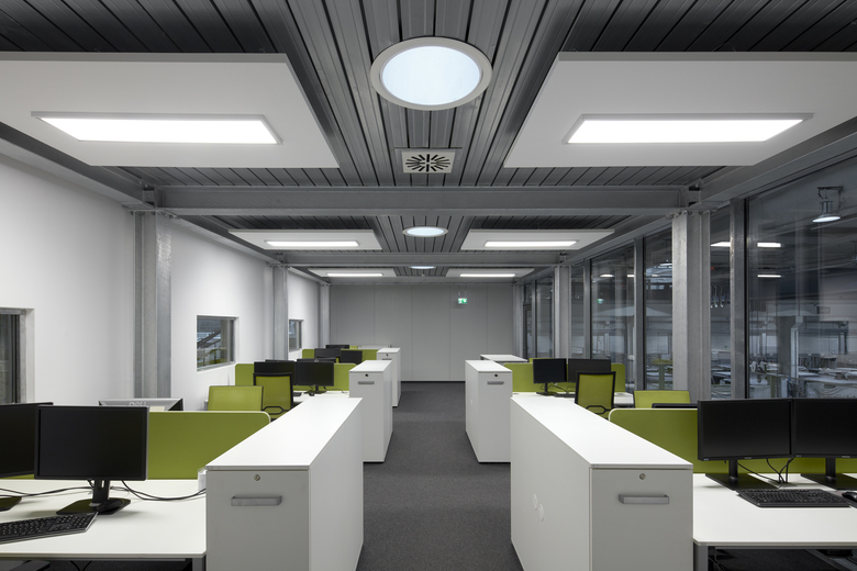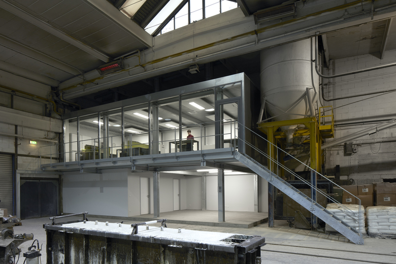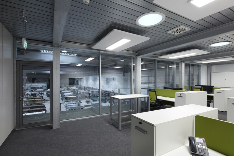 Bei laufendem Betrieb ein komplettes Planungsbüro einbauen? Das muss schnell gehen und soll möglichst nicht stören/ darf nicht stören. Die Konstruktionsteile werden weitgehend vorgefertigt: verzinkte Stahlskelettkonstruktion mit Blechpaneelen und Pfosten-Riegelfassade. Den authentischen Industrielook verstärken Noppenboden, Gitteroste, weiße Wände und Akustiksegel. Die komplette Glasfassade zur Werkstatt verschafft Ein- und Ausblicke. Heliostaten lenken und verstärken das Tageslicht. Wärmerückgewinnung realisiert die kontrollierte Lüftung, dazu eine Fußbodenheizung für behaglichen Komfort.