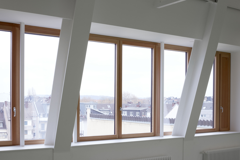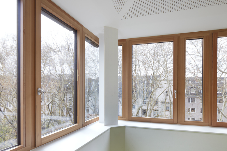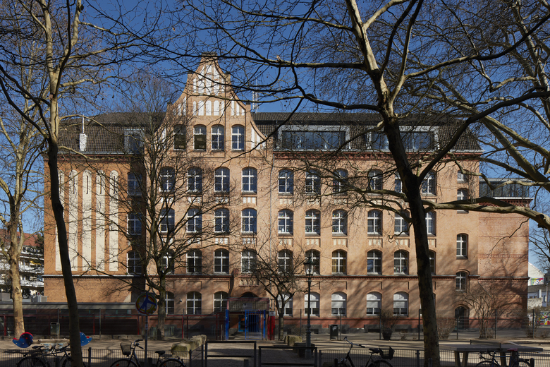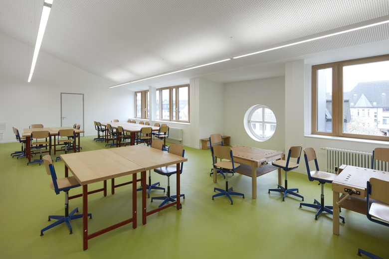 Das Schulgebäude von 1909 wird von zwei- auf dreizügig erweitert. pier7 architekten bauen das Dachgeschoss im laufenden Betrieb aufwendig aus: Altes Dach runter, neue Stahlrahmenkonstruktion rein. Auf dem Bestandsgebäude entstehen huckepack lichte Räume mit Rundumblick. Dazu zeltartige Decken mit bis zu 7 Metern Höhe und raumhohe Holz-Alu-Fenster mit Nachtlüftungselementen. Die Stahlrahmenkonstruktion ist sichtbar, Decken und Wände erstrahlen weiß, Fußböden hellgrün und Türen setzen gelbe Akzente. Eine Raumakustik ist integriert, die Dachflächen energetisch optimiert.