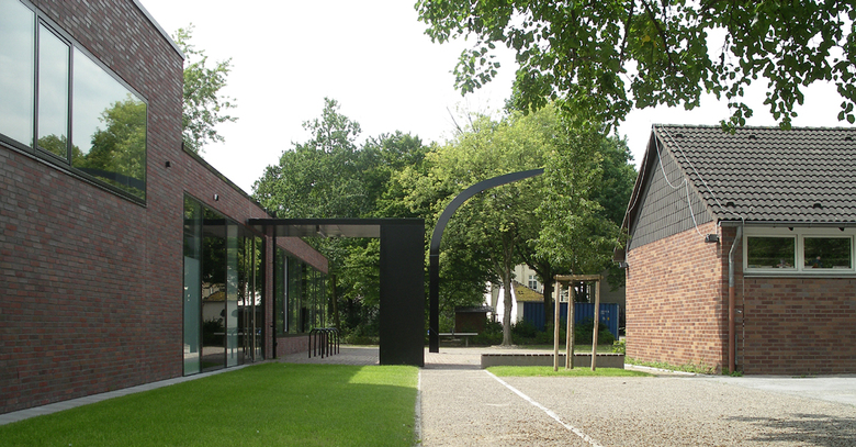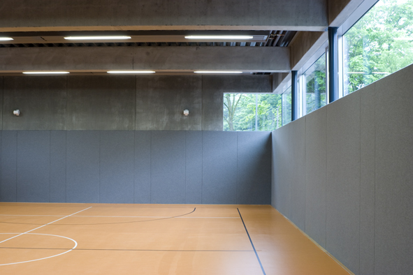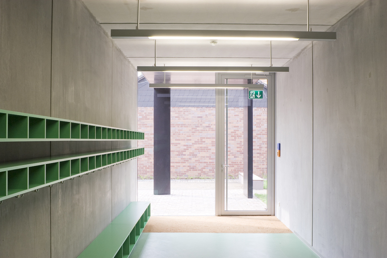 Organisation braucht Farbe. Außen erweitert Innen – Eine Gymnastikhalle bietet Platz für sportliche Aktivitäten. Normalerweise. Denkt man in Raum-, Farb- und Detailkonzepten, wird aus einem Kubus ein erfrischendes Erlebnisangebot. Drinnen organisieren orange und grün die Bereiche Service und Nutzung. Draußen inszeniert die Landschaftsplanung Design, Funktion und Natur. Insgesamt entsteht ein Baukörper, der auf Schulsport, Räume für die Ganztagesschule sowie auf Abendveranstaltungen eingerichtet ist.