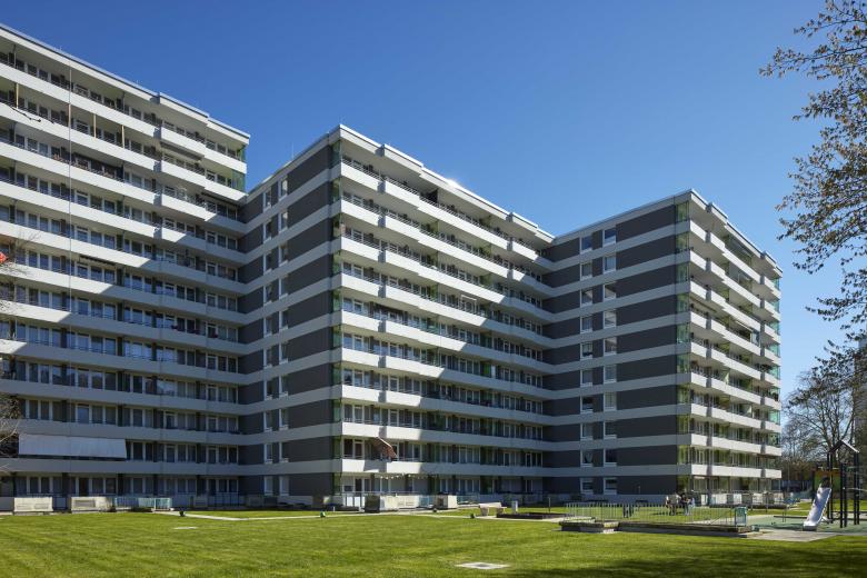 Klimawende im Bestand plus individualisierte Zuordnung der Wohnungen. pier7 architekten wandelt die 10 und 11-geschossigen Hochhäuser durch ein robustes Gebäudekonzept. Energetisch erfolgt die Aufwertung durch mineralische Wärmedämmung, Außenputz und Dachsanierung.