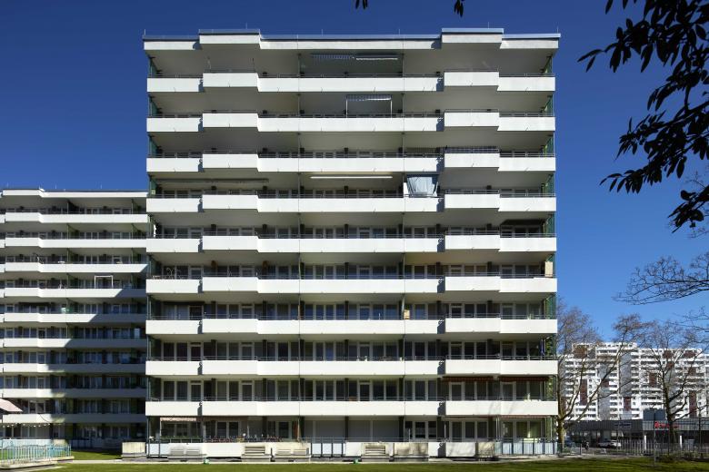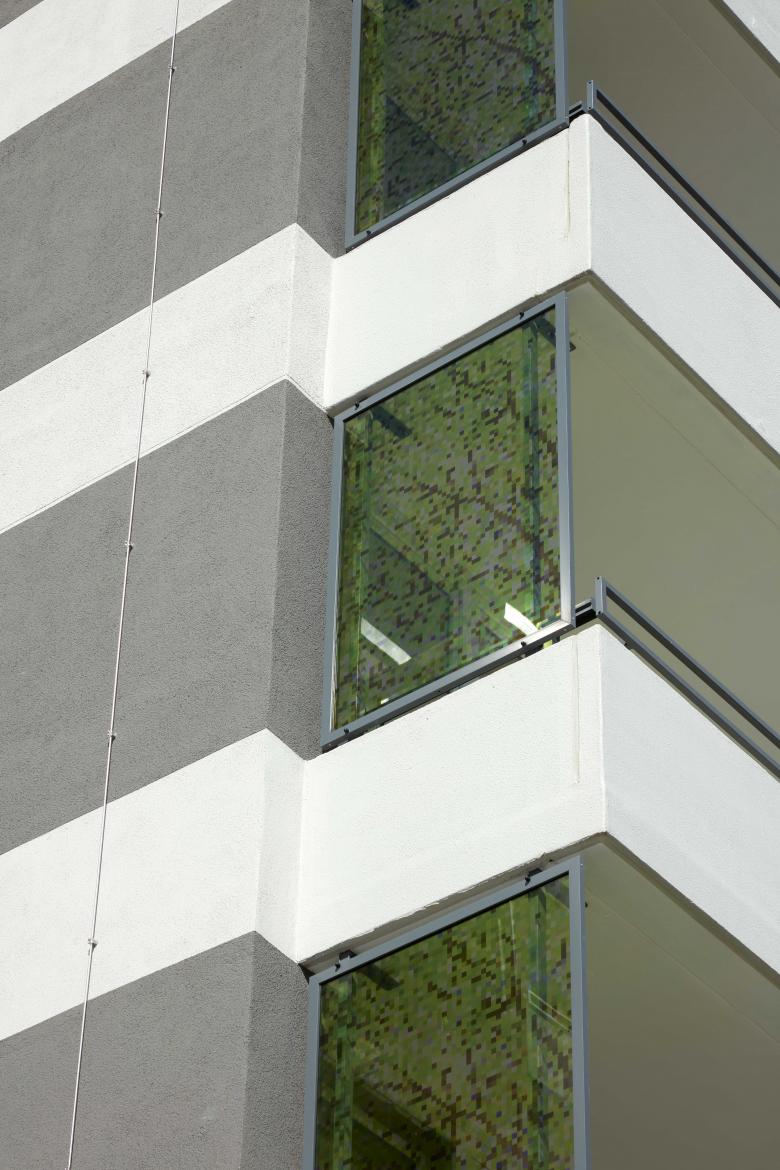 Die Putzstruktur der Balkone wechselt glatt mit strukturiert, jede einzelne Wohnung wird auf der Fassade sichtbar. Grün gepixelte Sichtelemente frischen die Häuser auf.