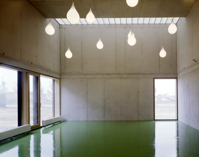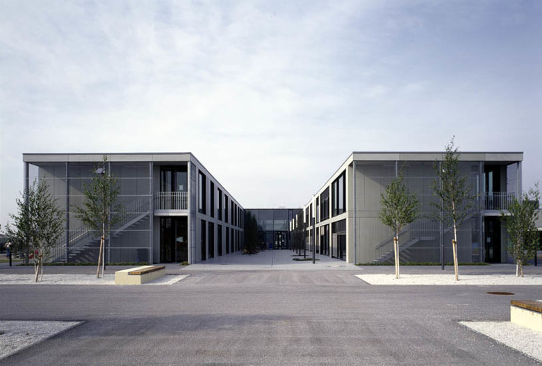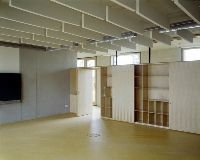 Symbiose – Fünf Nutzer ergeben unzählige Nutzungsvarianten für einen einzigen Gebäudekomplex. Das ist die Ausnahme. In Lübeck treffen Polizei, Kirche, Sport, Schulbetrieb und Kindertagesstätte aufeinander. Die strenge Führung übernimmt der Sichtbeton, die Lebendigkeit schafft das Farbkonzept, die vielfältige Nutzung wird vom zentralen Innenraumplatz erschlossen und durch geplanten Freiraum realisiert. Vorbildlich und sogar rekordverdächtig sind die Werte beim Energiebedarf, durch Blockheizkraft werden Traumwerte erreicht: 15 kWh/ (m² x a) Jahresprimärenergiebedarf, mit einem Anteil von 98,8% an erneuerbarerer Energie nach EnEV/ Energieeinsparverordnung.