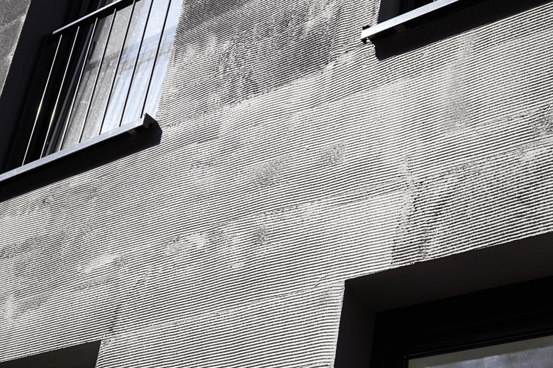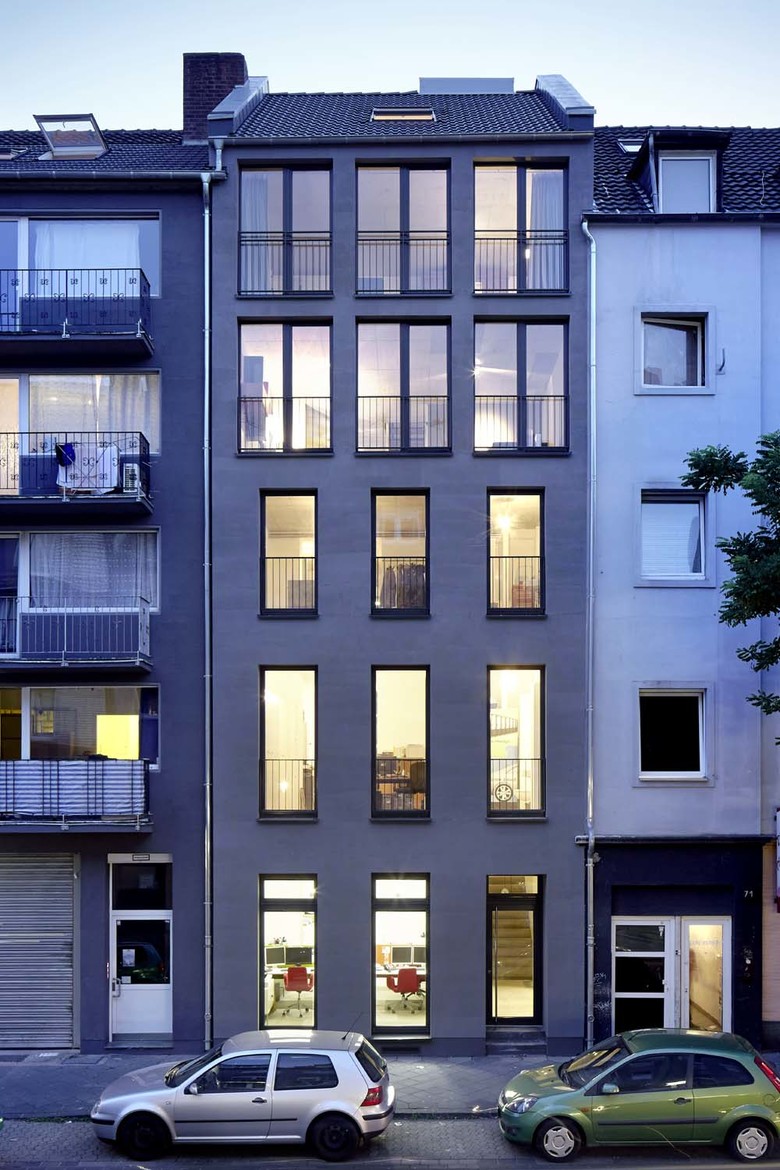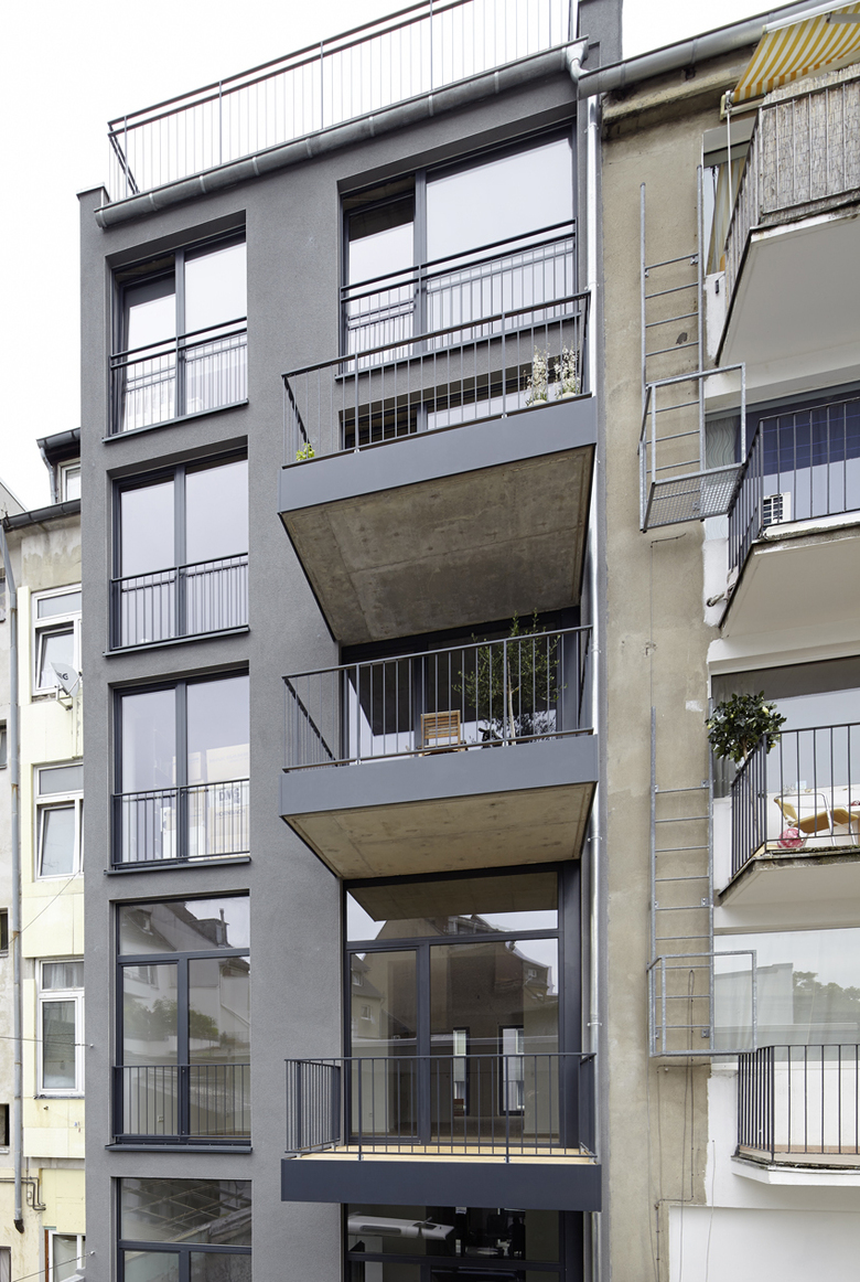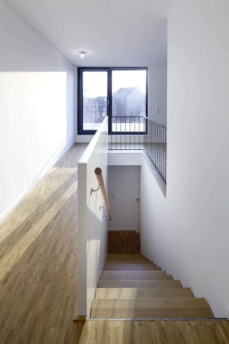 Nachverdichtung – Auf das bestehende 3-geschossige Gebäude werden 3 weitere Geschosse gebaut. Großzügige Öffnungen und die freien Grundrisse ermöglichen ein Durchwohnen zwischen Straße und Innenhof. Glatte, weiße Wände, sichtbare Betondecken, Estrich- und Holzfußböden und ein optimierter Energiestandard sorgen für eine behagliche und effiziente Wohnsituation.