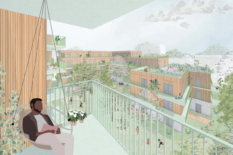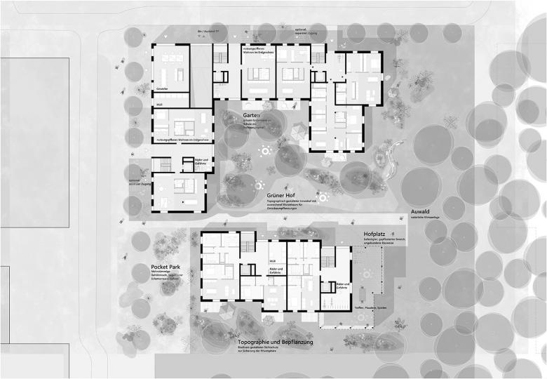 Die Grundkonzeption für Baufeld E sieht zwei Baukörper vor. Die beiden in Holzhybridbauweise geplanten Baukörper bilden im Norden zum Quartiersplatz eine ausgeprägte städtebauliche Kante mit (Klein)Gewerbe bzw. nutzungsoffener Wohnnutzung. Im Osten öffnet sich die Bebauung zum Auwald und schafft einen fließenden Übergang vom geschützten Innenhofbereich zum Naturraum.