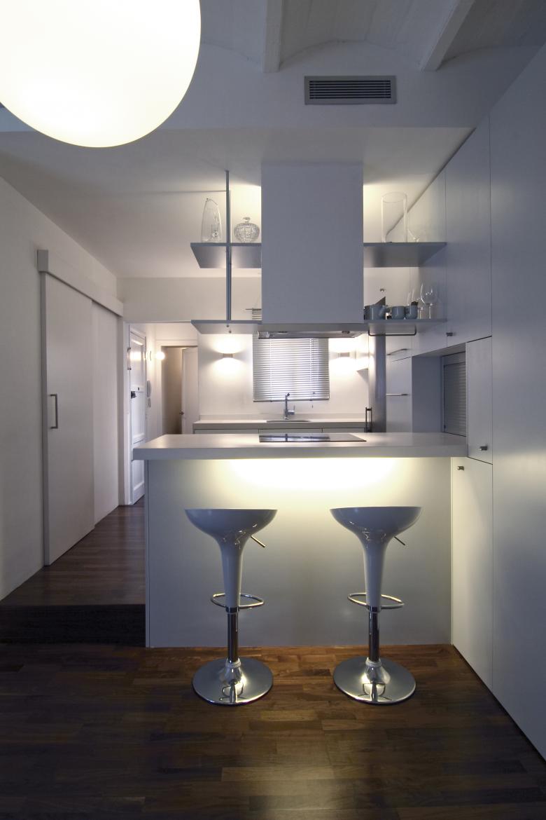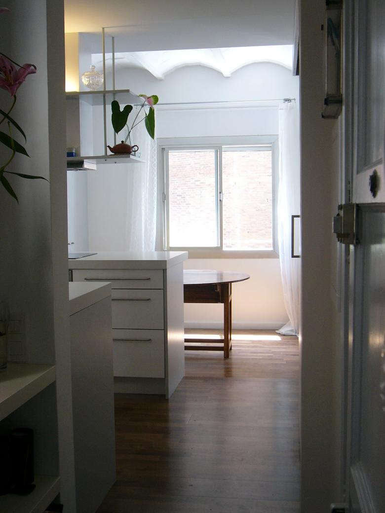 Reforma de un pequeño piso en La Barceloneta. La propuesta nace del reto de hacer habitable un espacio de 26 m2, en el que habitarán entre una y tres personas. Para ello, se coloca todo el mobiliario fijo en el perímetro dejando el máximo espacio liberado.