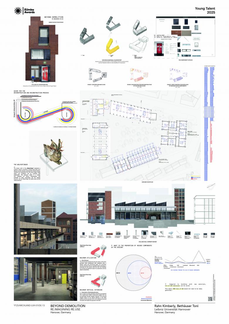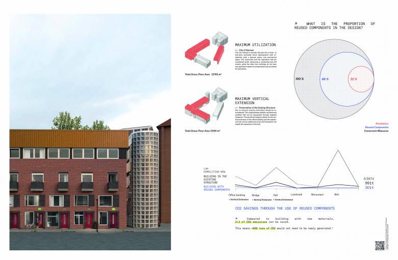 The result is an urban design with 68% reused components. This approach extends the life cycle of both the existing buildings as well as the components repurposed from the demolished building. The conversion of the site into flexible residential and public spaces enhances adaptability and significantly prolongs resource life.