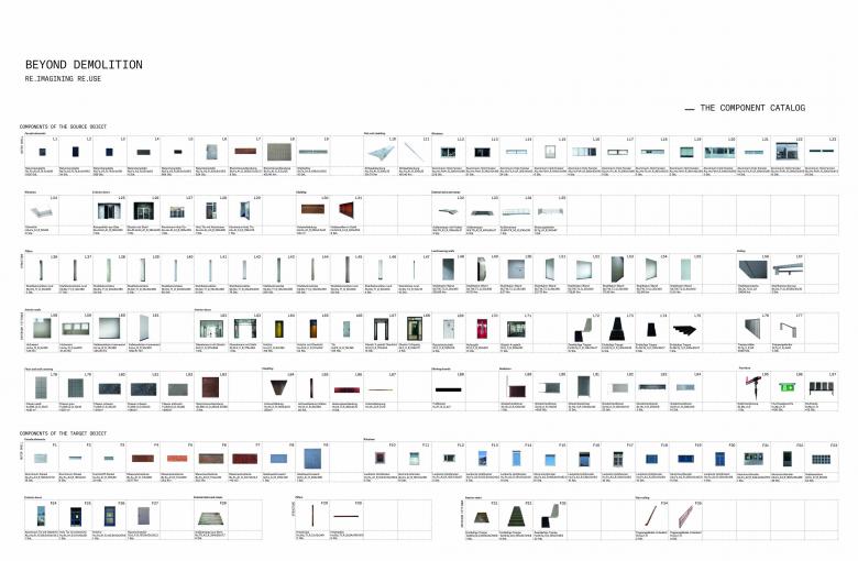 Our focus lay on reinforced concrete frame construction, as this type of structure is most frequently demolished in Hanover. By means of preselected criteria, we evaluated component reusability in a prototype: the source object, a 1960s office building. This evaluation resulted in a component reuse rate of approx. 85%, with 5,076 components available for the design.