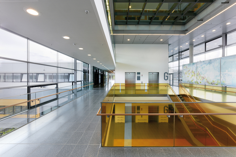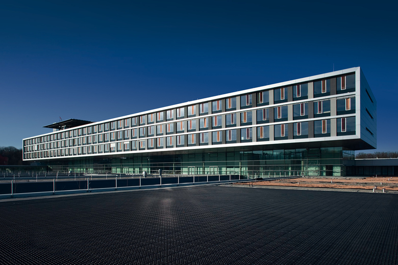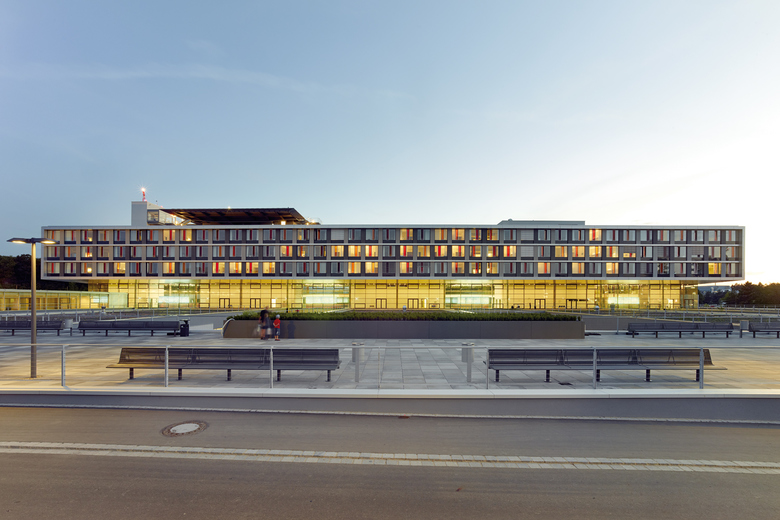 Neubau Klinikum mit 315 Betten und 15 OP-Räumen, Schwebendes Bettenhaus mit weit auskragenden Gebäudeteilen, Flachdecken mit Spannweiten bis 15,60 m