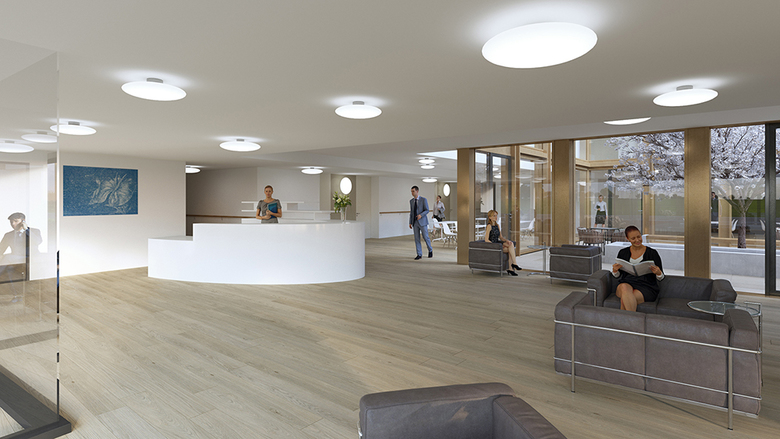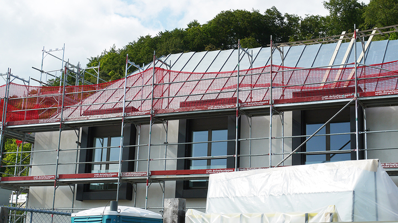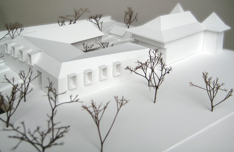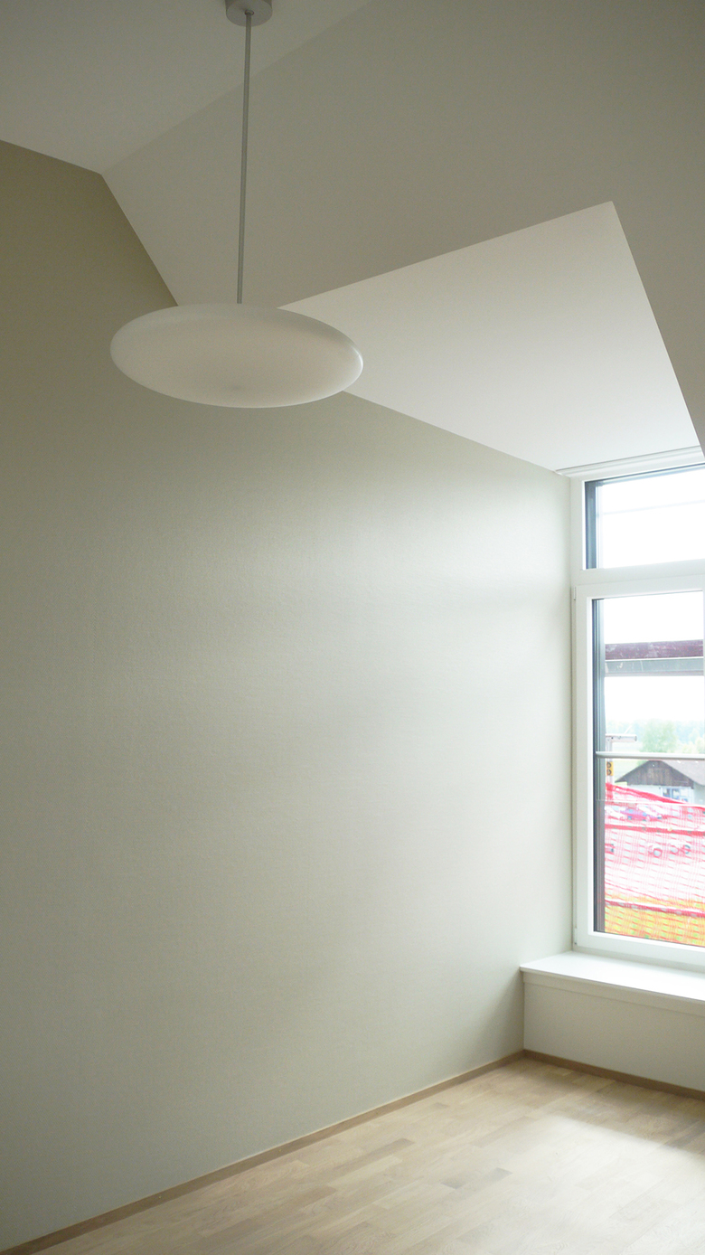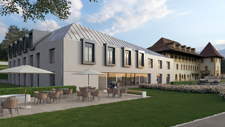 Der Neubau spricht eine klare zeitgemässe Architektursprache mit Elementen der lokalen Baukultur ohne das bestehende „Schlössli“ in seiner Präsenz zu konkurrenzieren. Dachform und Lukarnen werden stilistisch übersetzt und als vermittelnde Formelemente eingesetzt.