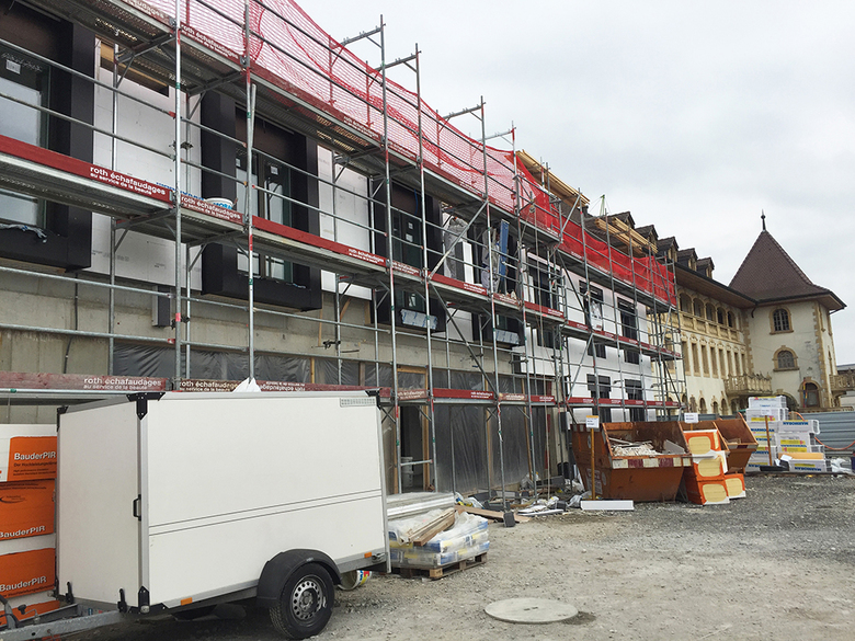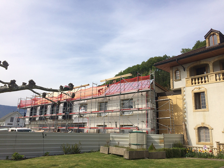 Das Projekt umfasst das bestehende Altersheim «Le Manoir» und einen Neubau der eine räumliche Verbindung auf zwei Geschossen schafft. Die zwei Volumen sollen als betriebliche Einheit funktionieren, aber klar als eigenständige Gebäude gelesen werden. Der Neubau folgt in seiner volumetrischen Entwicklung dem Terrainverlauf. Unter diesem Aspekt entwickelt er sich ab dem bestehenden Gebäude mit eine sanften Schwung in die Höhe.