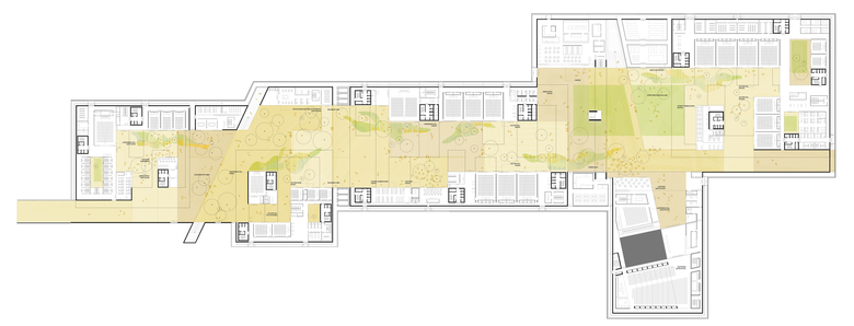 Il consueto rapporto orizzontale tra spazi aperti ed edificato è sovvertito e, liberato il suolo, gli edifici lasciano fluire uno spazio connettivo: si genera una dorsale est-ovest sulla quale gravita la vita del campus.