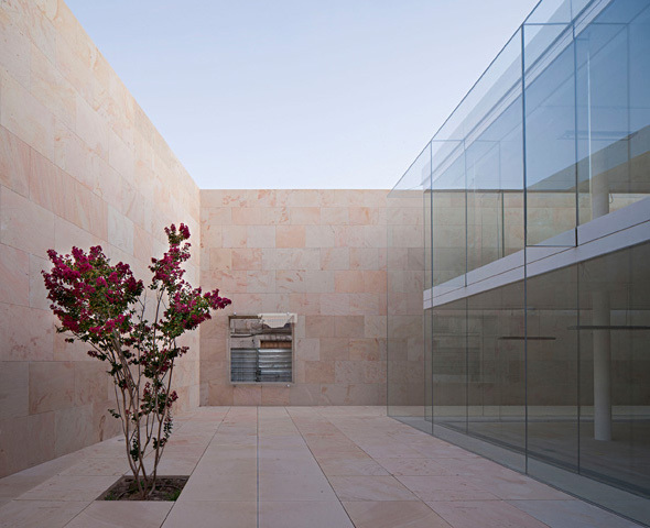 It is a stone box open to the sky that holds a crystalline box and protects it and tempers it, immersed in the midst of a wonderful garden.