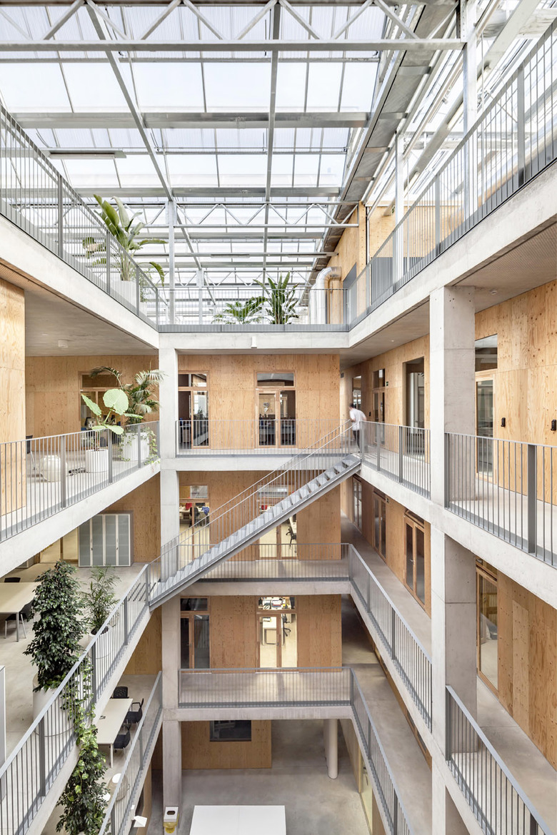 En el medio del edificio, cuatro patios verticales, con escaleras que conectan puntualmente los diferentes niveles, garantizan luz y ventilación a todos los espacios de trabajo, reduciendo el consumo de luz artificial y, por lo tanto, bajando las cargas internas. Estos patios, así como todo el espacio intermedio del edificio y la galería perimetral, albergan diversas especies vegetales mejorando el confort gracias al ajuste del gradiente de humedad.