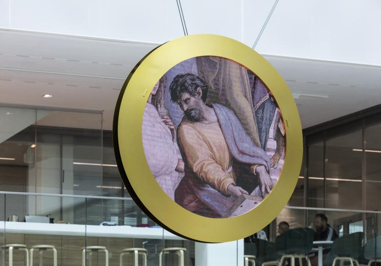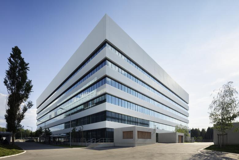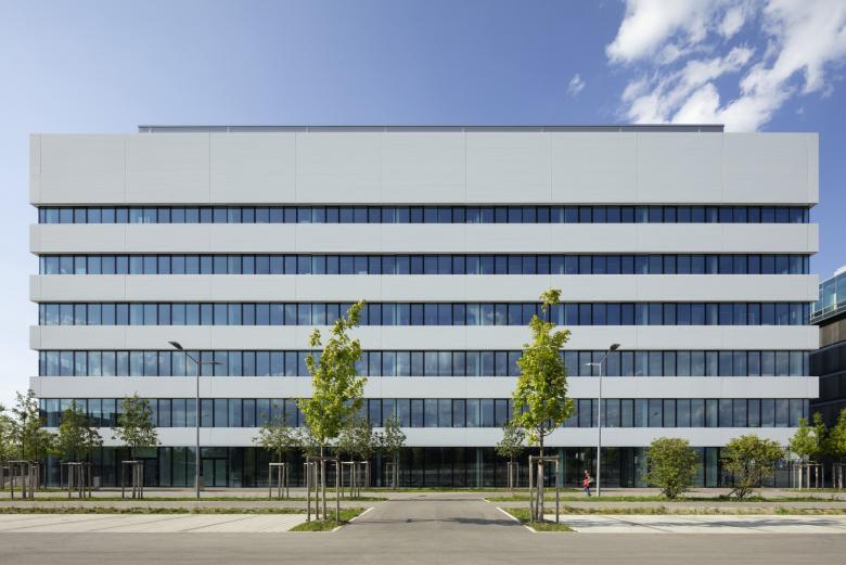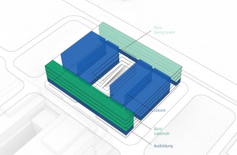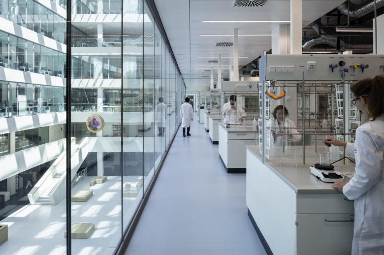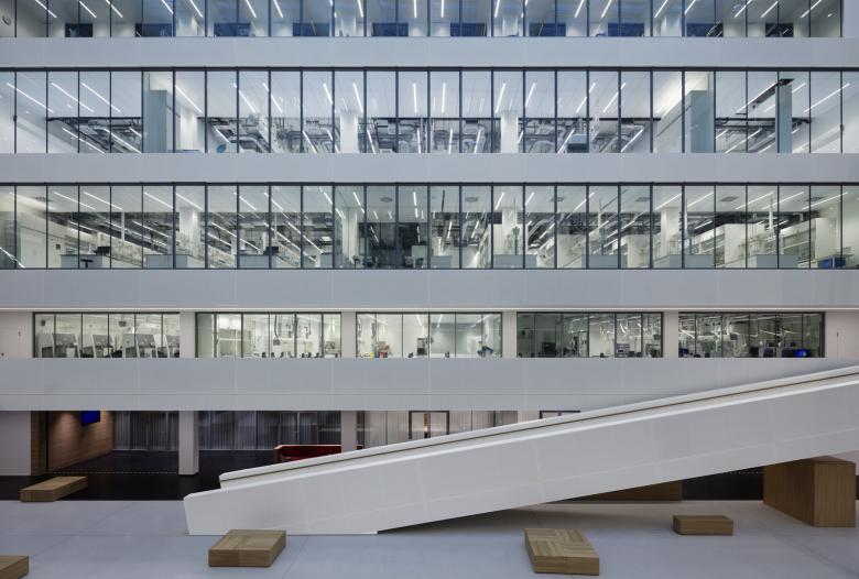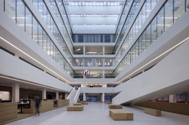 Die sechs Geschosse des Gebäudes mit insgesamt 37.900 m² Fläche gruppieren sich um ein zentrales Atrium, das die einzelnen Etagen und Divisionen durch Sichtachsen miteinander verbindet und zum pulsierenden Mittelpunkt des Gebäudes wird. Der helle, überdachte Raum streckt sich bis unters Dach und lenkt Tageslicht in die Innenräume. Das Erdgeschoss dient als Zone der Interaktion und der Kommunikation, die auch für Veranstaltungen genutzt werden kann und unmittelbar in das Bistro und den Konferenzbereich übergeht. Während die erste Etage dem Ausbildungszentrum vorenthalten ist, sind die oberen vier Stockwerke für Labor-und Büroarbeitsplätze bestimmt.
