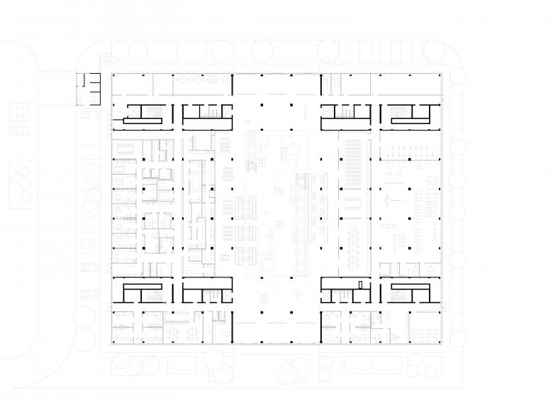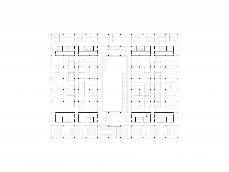 Sie verteilen sich auf je zwei Gebäudeflügel pro Geschoss um das zentrale Atrium und sind zusätzlich zur Erschließung in den Kernzonen von Aufzügen flankiert. An die Labors des Pharmakonzerns schließen im Westen und Osten Smart-Offices und Open-Space-Büroflächen an.