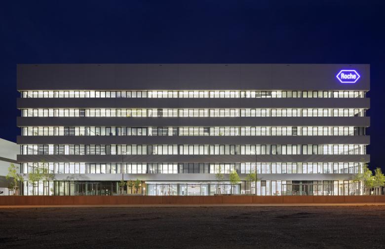 Der modulare Aufbau des kompakten Stahlbetonbaus basiert auf jeweils stringenten Grundrissrastern, die größtmögliche Flexibilität garantieren. Die Fassade des öffentlichen Erdgeschosses ist durchgängig verglast, in den oberen Etagen ist die Außenhülle entsprechend der Guidelines von Roche horizontal gegliedert. Durchgängige Brüstungen aus Fertigelementen teilen das Erscheinungsbild in horizontale Bänder ein. Mit der zunehmenden Sturzhöhe werden die Fensterbänder niedriger und reagieren so auf den zunehmenden Wärme- und Lichteinfall in den oberen Etagen.