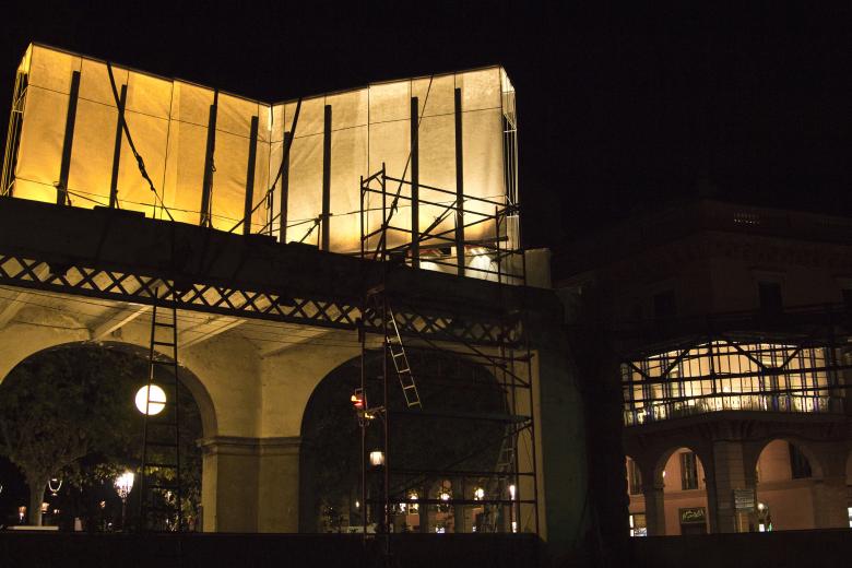 El devenir de la ciudad ha hecho que esta esquina quedara como una pareja incompleta. El papel de la pieza construida es el de reconstruir esta pareja, al menos por la noche. La falsa tribuna levantada sobre los arcos de la plaza, en el solar de una antigua gasolinera, quiere ser una réplica vagamente similar a la tribuna existente en la cara opuesta. Se construye con cuatro jaulas de armadura terminadas en taller. Acopladas en obra, adquieren la misma dimensión que la otra y algunos elementos decorativos ayudan a establecer la relación, aparte de la misma iluminación. La esquina, durante unas horas, estuvo completa.