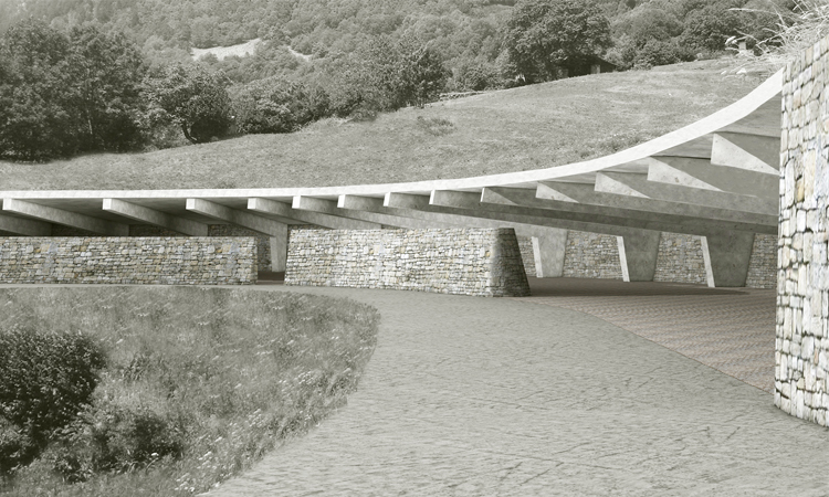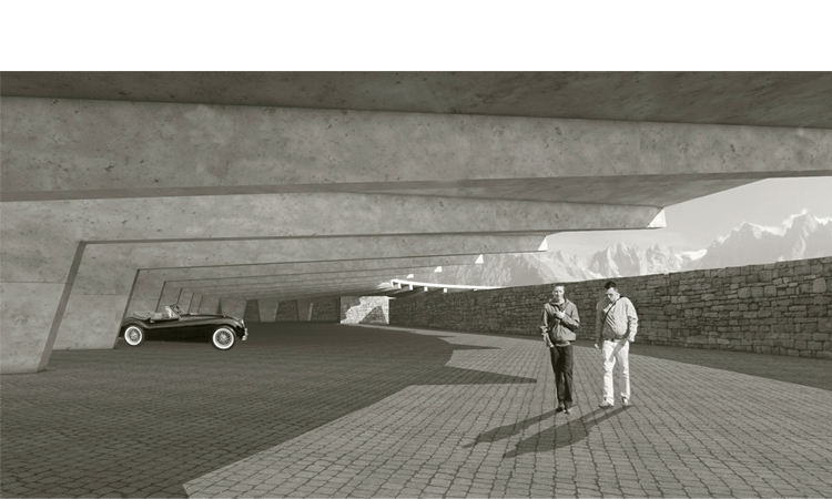 Per raggiungere tale intento si sono privilegiate quelle soluzioni che non comportassero né importanti movimenti di terra né sostanziali modifiche dellʼassetto del terreno naturale esistente. Il progetto prevede unʼautorimessa seminterrata ad un solo piano la cui pianta sinuosa segue le curve di livello del terreno esistente, configurandosi come una sorta di prosecuzione dei terrazzamenti presenti in questa zona del paese. La soluzione proposta, sviluppandosi su un solo livello, non necessita di ingombranti elementi di distribuzione verticale quali scale ed ascensori e garantisce inoltre una ventilazione naturale degli ambienti.