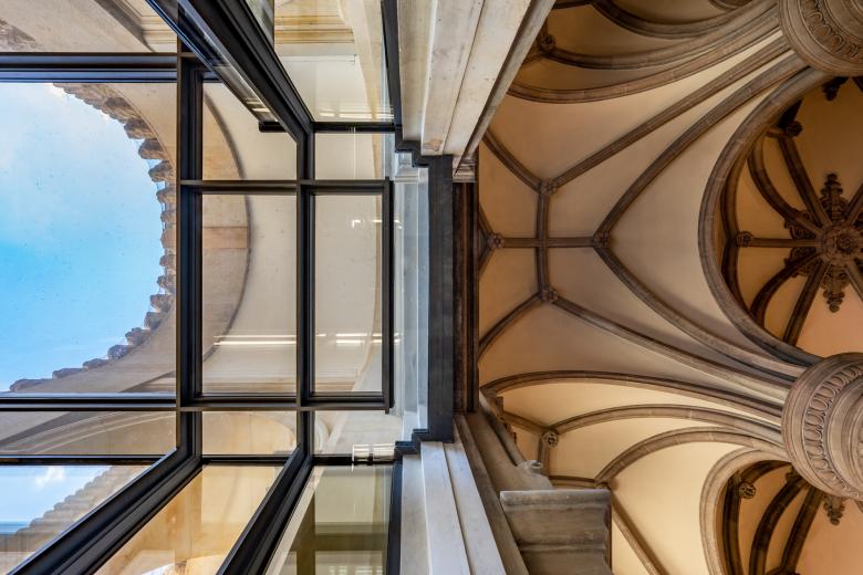 Vom Grundsteinkeller über acht Etagen wurde mit Respekt vor der historischen Bausubstanz des Rathauses ein durchgehender Aufzugschacht hergestellt in den ein gläserner Fahrstuhl eingestellt wurde.
