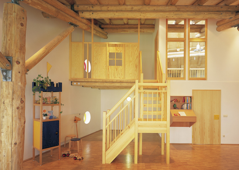 Das Gebäude wirkt, als sei es direkt mit der Natur verbunden und bietet kleinen wie auch großen Besuchern eine einmalige Atmosphäre. So können die Kinder die Haptik und Wärme der Hölzer erspüren und eins-zu-eins den Einsatz natürlicher Ressourcen erleben. Die Dächer sind mit einem natürlich bepflanzten Gründach versehen.